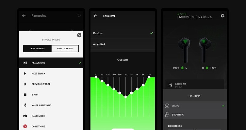 Mindkét 10 grammos egységre raktak LED háttérvilágítással megtoldott, érintős kezelőszerveket, így anélkül válaszolhatunk hívásokra, aktiválhatjuk a hangasszisztensünket, állíthatjuk a hangerőt vagy mondjuk léptethetjük a lejátszási listát, hogy a kezünkbe vennénk az okostelefonunkat. Ha ez nem volna elég, a Razer Audio App segítségével lehetőségünk nyílik babrálni az equalizerrel, átprogramozhatjuk, hogy a különböző gesztusoknak mi legyen a hatásuk, netán eljátszogathatunk a fényeffektekkel.