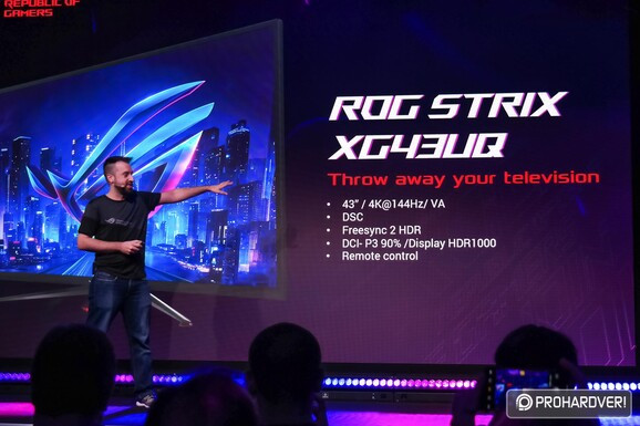 A kijelzők területén az első újdonság a találóan „dobd ki a tévéd” szlogennel érkező ROG Strix XG43UQ, mely egy 43 hüvelykes, 4K felbontású 144 Hz-es VA panelt használ. A DisplayHDR 1000-es, FreeSync 2 HDR-t kínáló eszközhöz még távirányító is jár. Kisebb testvére a ROG Strix XG27UQ, mely szintén 144 Hz-es, de VA helyett IPS panelre épül, és elmarad az igazi HDR is, hiszen itt csak DisplayHDR 400 tanúsítványt kapunk. Mindkét készülék újdonsága a DisplayPort 1.4 jelentette sávszélességkorlát átlépését lehetővé tévő Display Stream Compression (DSC) támogatása, amihez persze megfelelő grafikus kártya is kell.