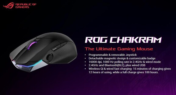 A Chakram egyébként a trendeknek megfelelően vezetékes és kétféle (Bluetooth és 2,4 GHz-es) vezeték nélküli adatátviteli megoldással is használható, tölteni pedig nemcsak kábelen át, de Qi töltővel is lehet. Az előbbi esetében egyébként az ASUS állítása szerint 15 perc elég 12 órányi játékhoz. Az érzékelő pontos típusát egyelőre nem árulták el (de holnap megpróbáljuk kiszedni belőlük), de az kiderült, hogy 16 000 cpi maximális felbontásra, 1000 Hz-es lekérdezésre számíthatunk. A szenzor 400 ips sebességig képes követni mozdulatainkat, ami elég jónak tűnik, a fő kapcsolók pedig cserélhetőek.