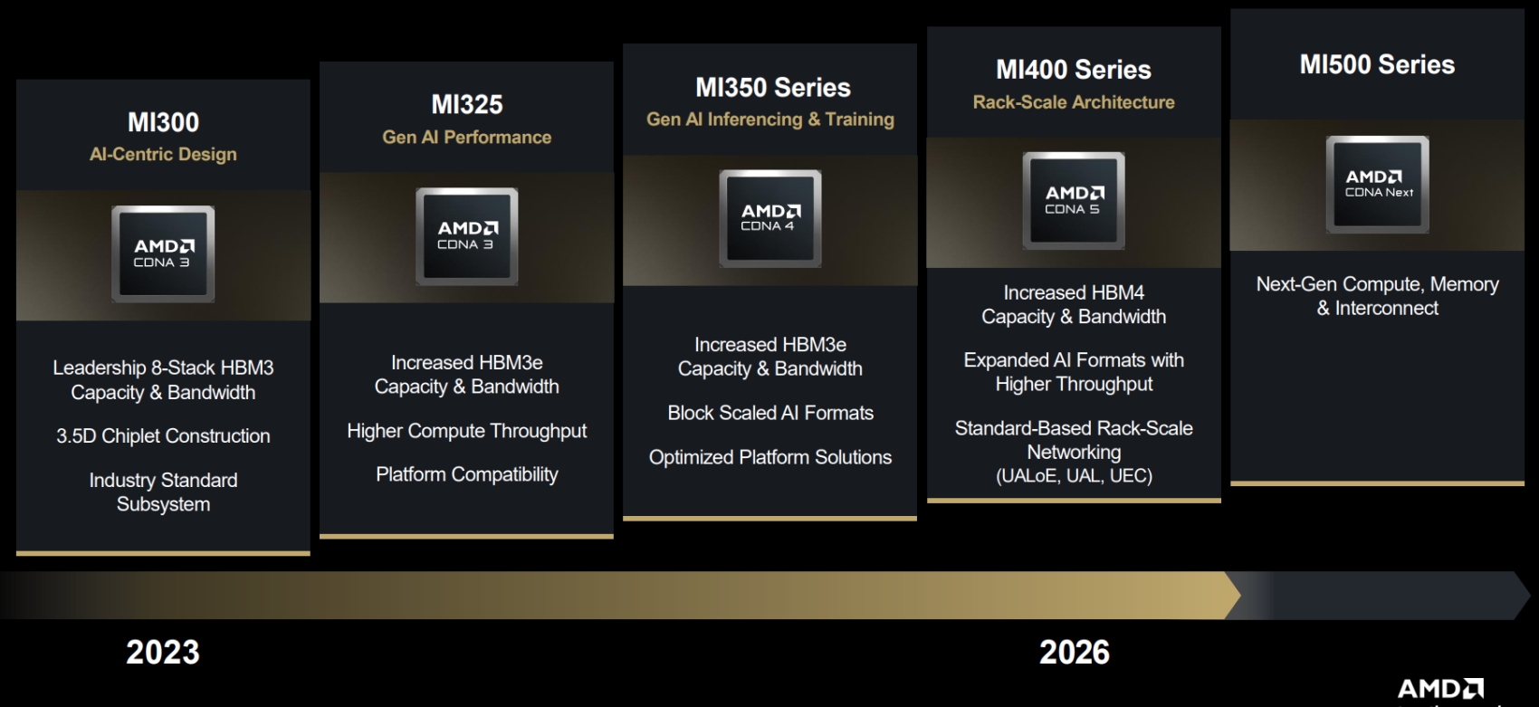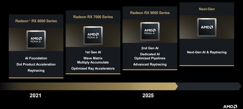 Az AI gyorsítók piacára a CDNA 5 érkezik, szintén jövőre, az Instinct MI400 sorozatba, és ez lesz az AMD első olyan megoldása, amely valódi rack scale lehetőséget kínál. A játékosoknak is készül az új generáció jobb AI-t és sugárkövetést biztosító képességekkel. Itt felmerülhet a kérdés, hogy hova lett az UDNA, amiről a cég beszélt korábban. Valójában az új CDNA és RDNA egyszerre UDNA is. Itt a lényegi szempont, hogy az alaparchitektúra lett összevonva, de mivel a célzott piac eltérő, a multiprocesszorok azért különbözni fognak, csak a rendszer működésének alapja azonos lesz, ezt jelenti igazából az UDNA.