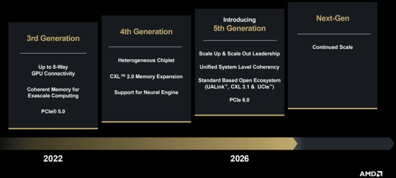 A vállalat a fentieken túl bejelentette az ötödig generációs Infinity Fabric interfészt, amely rendszerszintű koherenciát biztosít majd az egyes részegységek között, miközben támogatja a PCI Express 6.0-t, illetve számos nyílt konstrukciót, köztük az UALinket, a CXL 3.1-et, illetve az UCIe-t. Az új Infinity Fabric a jövőre érkező Helios rack alapja lesz.