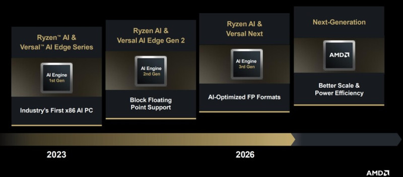 Az NPU tekintetében a cég a harmadik generáció bevezetésén dolgozik, amely új adatformátumokat hoz, és a Ryzen AI részegység, illetve a következő generációs Versal sorozat része lesz, méghozzá jövőre.