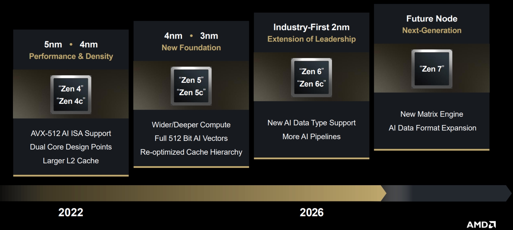 A processzormagok tekintetében a Zen 6 a következő nagy dobás, amelynek szokás szerint lesz Zen 6c kiadása, méghozzá jövőre. Mindkettő 2 nm-es TSMC node-on készül, és új, AI-hoz való adattípusokat fog támogatni. Ezt követi majd Zen 7, szintén AI fókusszal, de erről még nem lehet sokat tudni, azt leszámítva, hogy modernebb gyártástechnológiával készül majd, és új mátrixfeldolgozót vezet be.