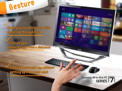 A Samsung erre az esetre integrálta AIO Series 7 egybepécéibe a Gesture UI-t, amivel a kijelző tapogatását helyettesíthetjük egyszerű kézmozdulatokkal, szimplán a beépített kamera és egy szoftver segítségével. És itt most nem csak arról van szó, hogy bizonyos kézjelekkel bizonyos funkciókat hajthatunk végre, hanem kvázi egy vezeték nélküli egér funkcióját válthatjuk ki tenyerünkkel. A gyártótól egyébként nem áll távol ez a technológia, hiszen egyes tévéi már hang- és kézvezérléssel is irányíthatók (Smart Interaction), így csak idő kérdése volt, hogy mikor szivárog át hasonló megoldás az IT termékeikbe. Reméljük hamarosan a notebookokban is üdvözölhetjük a technológiát, aminek működését az alábbi videó remekül példázza.