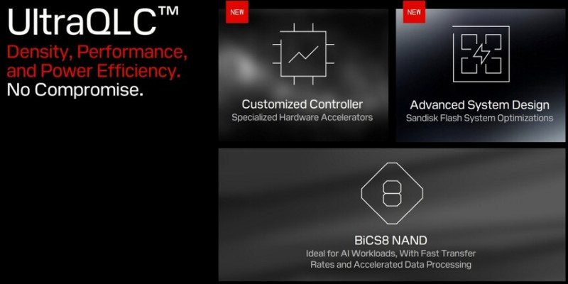 Maga az UltraQLC egyfajta gyűjtőnév, ami egyszerre takarja a SanDisk BICS8-as, QLC-s 3D NAND flashmemóriáját, a vállalat saját fejlesztésű, 64-csatornás vezérlőjét, illetve a működéshez szükséges firmware-t. A titok valójában a vezérlőben rejlik, amely különböző részfeladatokat végző gyorsítókat tartalmaz, így biztosítva az adatok hatékony kezelését. Ez a sok csatorna miatt kiemelten fontos szempont.