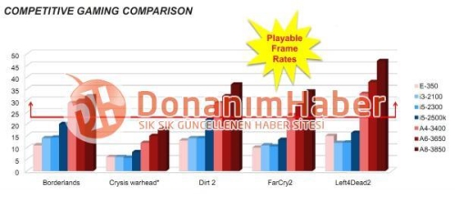 A kiszivárgott tesztben egy Core i3-2100, egy i5-2300 és egy Core i5-2500K kapott helyett az Intel oldaláról. Összesen 12 végrehajtóegységével jelenleg ez utóbbi rendelkezik a legmagasabb grafikus teljesítménnyel a kékek mezőnyében. Az AMD partvonaláról az A4-3400 mellett egy A6-3650 és egy A8-3850 került bevetésre. A konkrét felbontásról és részletességi beállításról ugyan nem esett szó, de a grafikonról jól kivehető, hogy a még mindig igen erőforrásigényes Crysis Warhead kivételével, szinte mindenhol játszható szintet tudott produkálni mindhárom APU.