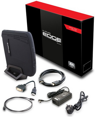 Az Edge VS4 az egyszerűbb modell, ebben egy 1,9 GHz-en ketyegő, duplamagos AMD A4 APU található, amely magában foglalja a Radeon HD7400G grafikus alegységet is. Ehhez 2 x 2 GB memóriát és egy 320 GB-os merevlemezt társított a gyártó, vagyis egy olyan konfiguráció körvonalazódik, ami a mindennapi munkára és szórakozásra a legtöbb felhasználó számára elégséges lenne. A Gigabit Ethernet mellett vezeték nélkül IEEE802.11b/g/n Wi-Fi és Bluetooth 3.0 kompatibilis adapterek segítségével képes kommunikálni. Hátoldalán és előlapján minden fontosabb csatlakozó ott sorakozik: egy HDMI és egy Mini DisplayPort videokimenet, analóg és digitális (optikai S/PDIF) audioaljzatok, 2 x USB 3.0 és 4 x USB 2.0 port és SD kártyaolvasó. Táplálása egy 65 wattos külső AC/DC adapterrel történik.