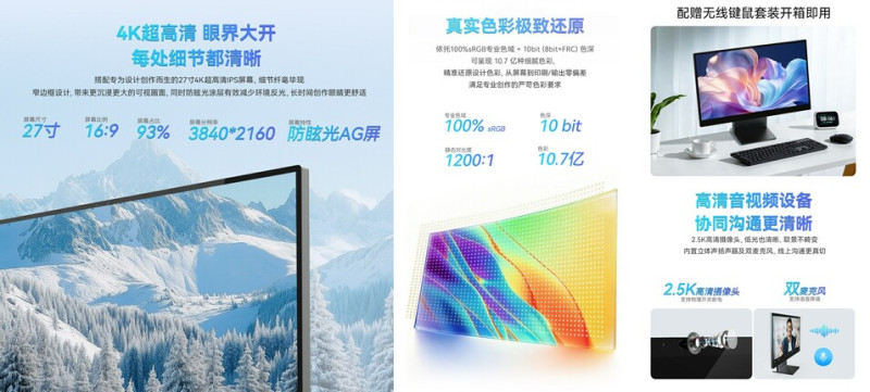Maga a (szintén fémburkolatos) kijelző egy 27 hüvelykes IPS panel, amely az FRC segítségével megjeleníthető, 1,07 milliárd színt 100 százalékos sRGB színtérlefedettséggel prezentálja, és a 3840x2160 pixeles felbontáshoz – kiábrándító módon – csak 60 Hz-es képfrissítési rátát párosít. A 360 cd/m² tipikus fénysűrűségű képernyő statikus kontrasztaránya 1200:1, és bár a válaszidejét nem említik, azt igen, hogy a felső kávájában egy 1440p-s webkamera figyel.
