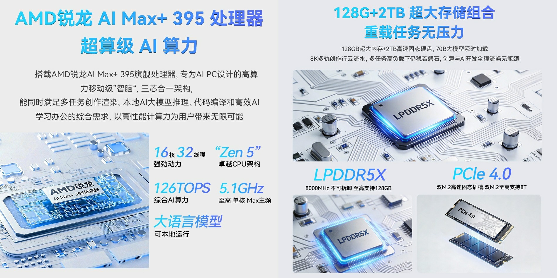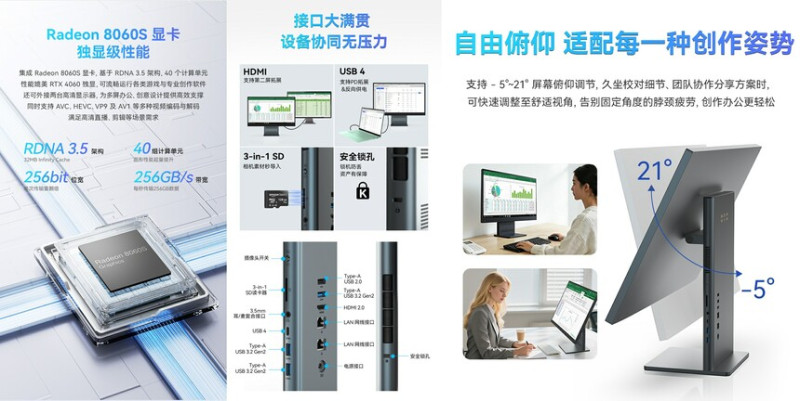 Az AideaONE R27 néven bemutatkozó, Windows 11-gyel érkező masina 16 magos/32 szálas, 5,1 GHz-ig boostoló AMD Ryzen AI Max+ 395 APU-ra épül, amiben Radeon 8060S IGP teljesít szolgálatot, szóval a grafikus jellegű alkalmazásokban sincs szégyellni valója a jószágnak, főleg, mivel a chip 96 GB rendszermemóriát tud megcímezni VRAM-ként, ráadásul halmozottan profitálhat a sebességéből. Itt jön a képbe a 128 GB-nyi, 8000 MHz-es effektív órajelen ketyegő LPDDR5X RAM, amit ugyan leforrasztottak, de ilyen kapacitással nem valószínű, hogy egyhamar bővítenünk kellene.