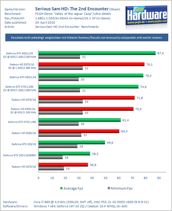 A PC Games Hardware letesztelte a játékot a ma kapható legmodernebb grafikuskártyákkal, beleértve a nemrég kijött nVidia GeForce GTX 480/470-et, és az AMD Radeon HD 5870/5850-et is. A teszteket kétféle felbontásban végezték. Az egyik, a ma már átlagosnak számító 1680x1050-es beállítás volt, melyben 4xMSAA és 16xAF látványjavítókat alkalmaztak. Az eredményeket az itt látható grafikonon vehetitek szemügyre: