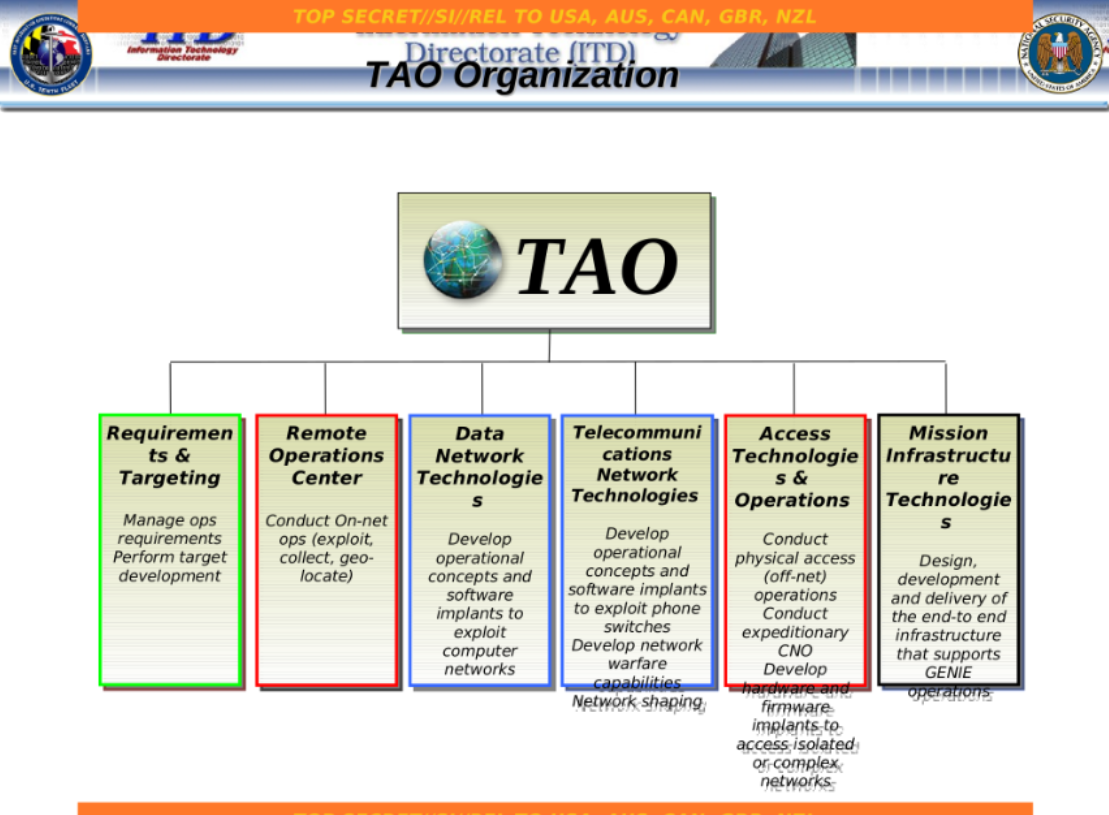 A dokumentumokban újra szóba kerül a korábbi kiszivárogtatás után hírhedtté vált speciális egység, a Remote Operations Center, ahol a külföldi hálózatok, rendszerek elleni támadásokat tervezték és menedzselték (Tailored Access Operations). A belső hírlevelekből és oktatási anyagból képet kaphatunk arról, hogy miként szervezték meg ezt a központot, és különösen érdekes, hogy szerepel benne egy kódrészlet, amely egy saját tervezésű billentyűzetfigyelő malware-ből származik (a kód esetében nem egészen világos, hogy ez is a Snowden által megszerzett anyagokból származik-e vagy más forrásból – Appelbaum már máskor is közzétett olyan dokumentumokat melyek egész biztosan nem Snowdentől származnak).