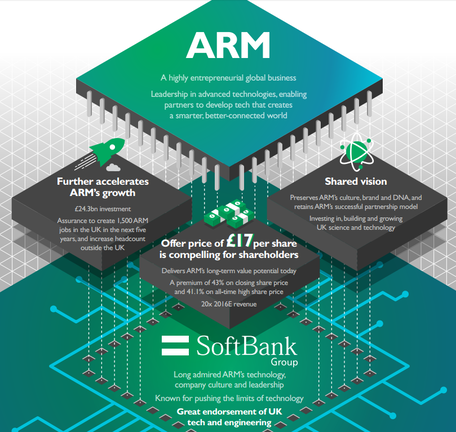 A japán SoftBank megállapodott az ARM Holdings felvásárlásáról. Az üzlet értéke 24,3 milliárd angol font, vagyis 9,19 billió forint. A részvényenkénti 17 font, amit a japánok fizetnek a papírokért, 43 százalékkal magasabb a pénteki záróértéknél. Az ARM vezetősége minden bizonnyal javasolni fogja az ajánlat elfogadását a részvényeseknek, akik a történelmi csúcshoz képest is 41,1 százalékkal magasabb összeghez juthatnak így. A rekord keretösszegű üzlet pénzügyi hátterét a japán Mizuho Bank hosszú lejáratú hitelével valósítják meg a felek.