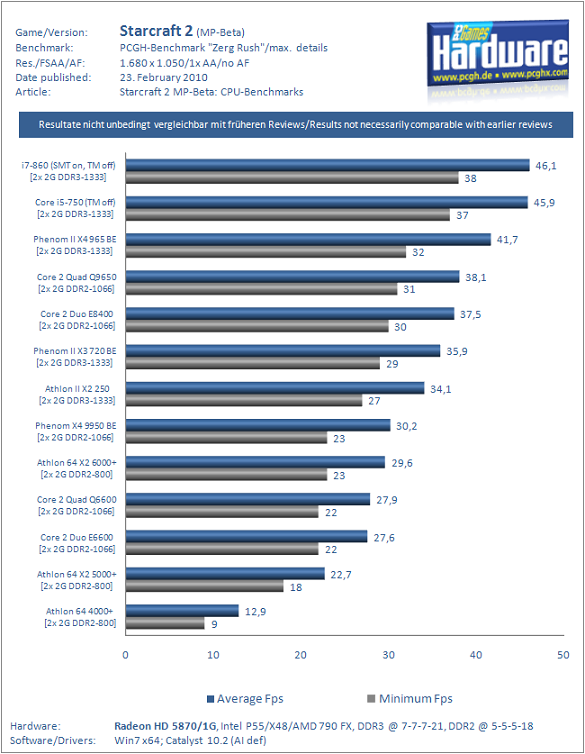 Eredmények: A Windows 7 Task Manager tanulsága szerint a StarCraft II bétája csak két processzormagot használ, ennek fényében az eredmények a következőek voltak: Az Intel négymagos Q6600-asa csak egy hangyányival volt gyorsabb kétmagos rokonánál, az E6600-nál. De a StarCraft II nagyon jól reagál a plusz cache méretre - különösen az E8400 és a két Lynnfield magos CPU húz hasznot belőle, míg az Athlon II X2 250 itt hátrányba kerül. Az AMD Phenom-ok nagyon jól teljesítenek, de nem közelíthetik meg az Intel Core i5-ös és i7-es processzorait. Az egymagos Athlon 64 4000+ processzor pedig nagyon lassúnak bizonyult.
