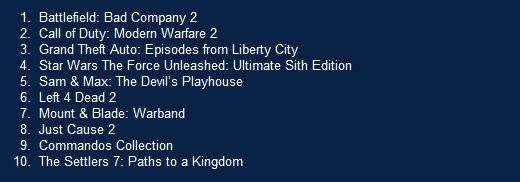 Még mindig dobogós helyet foglal el már hónapok óta a Modern Warfare 2 valamint ennek konkurens játéka, a Bad Company 2 is a múlt heti Steam összeállításon. A GTA 4 kiegészítője beért egy harmadik hellyel, amely meglehetősen szép eredmény. A teljes játékcímek az alábbi listán tekinthetőek meg: