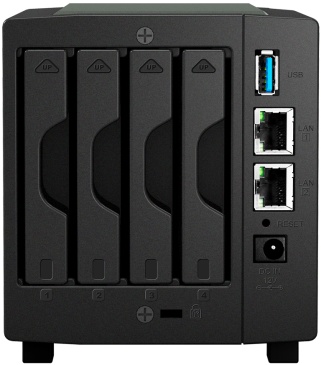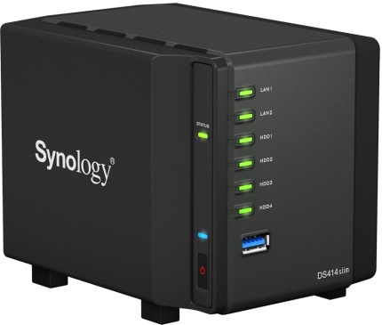 A DiskStation DS411slim régóta várt utódjának számító friss DS414slim NAS lelke ezúttal egy FPU-val kiegészített 1,2 GHz-es Marvell Armada 370 SoC, ami mellé 512 MB DDR3 RAM-ot társítottak. Négyrekeszes kialakítása révén négy darab adattároló befogadására képes, legyen az HDD vagy SSD, de az össz tárkapacitás nem haladhatja meg a 6 TB-ot. Ezek természetesen menet közben is cserélhetőek, köszönhetően a Hot Swap kialakításnak. A behelyezett egységeket RAID kötetekbe fűzhetjük, a legegyszerűbb JBOD-tól egészen a RAID 10-ig, illetve egyes módok között a migrálás is megoldható, továbbá a kötetek kiterjesztésére is van lehetőség, ha csak később töltenénk fel az összes rekeszt. Továbbá két USB 3.0-s port is rendelkezésre áll, amire további – külső – adattárolók illeszthetők. A csatlakozási lehetőségek terén egyébként két Gigabit Ethernet csatlakozó áll bevetésre készen.