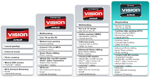 A második, Vision Premium szinten már képbe jön a multitasking, vagyis a több alkalmazás egyidejű futtatása. Az ide besorolt hardver már elég erős képszerkesztéshez, zene- vagy videokódoláshoz, alkalmas HD filmek nézésére és a játékokat is jobban bírja. A Vision Ultimate kategóriát TV felvételek készítéséhez, online játékokhoz, képek, zenék és videók szerkesztéséhez ajánlja az AMD. A csúcsot a Vision Black jelenti, amely elsősorban a komoly játékosok és HD videókat szerkesztők számára lehet érdekes.