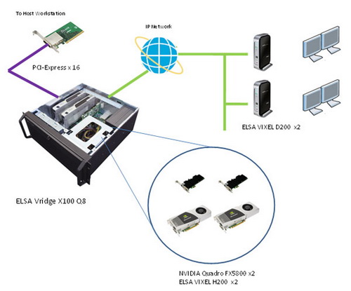 Az ELSA Japan készítette rendszer két NVIDIA Quadro FX 5800-as általános célú gyorsítót és két ELSA Vixel H200 kártyát alkalmaz, amelyekkel a rendszer távolról is irányíthatóvá válik. Ezt a Teradici cég specialitásának számító PC-over-IP technológia teszi lehetővé. A Vridge X100 Q8 ezzel képessé válik arra, hogy nagy felbontású videofájlokat játsszon le, vagy háromdimenziós alkalmazások képét állítsa elő, majd ezeket hálózaton vagy interneten keresztül továbbítsa.