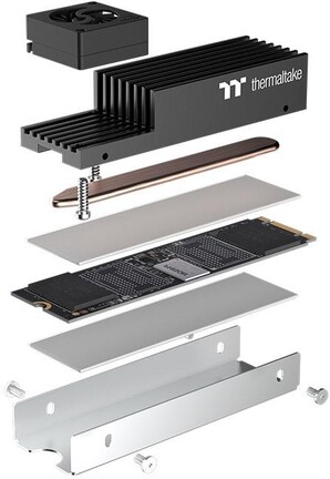 Egyre forróbbá válik az M.2 SSD-k hűtési megoldásainak piaca: egyik legújabb szereplője a Thermaltake-től érkezik és az MS-1 névre hallgat. A 18 x 23 x 74 mm-es méretű, blower típusú ventilátorral dolgozó kis egységnél a gyártó nem bízta teljes egészében az alumínium bordázat alaplemezére a hővezetést, azt egy 6 mm-es átmérőjű, de erősen lapított hővezető csővel is kiegészítette.