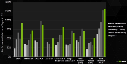 Az NVIDIA pár tesztet is lefuttatott 2,5 GHz-en üzemelő Denver magokkal. Ezeket a fenti képen lehet látni, de mindegyik mérés szintetikus, így a gyakorlati tesztekre a megjelenésig várni kell. Utóbbi szerencsére nincs olyan messze, hiszen a Tegra K1-nek lesz olyan verziója, amely két Denver magot használ.