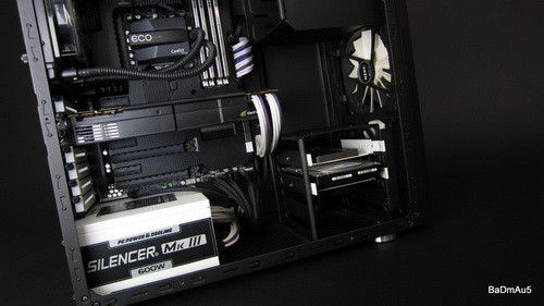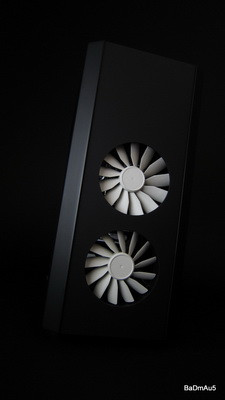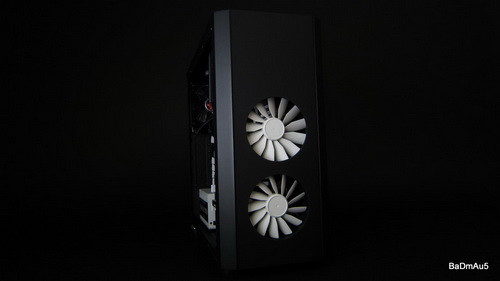 A Turbo Core 3K elnevezésű konfiguráció már első pillantásra kitűnik a tömegből, ugyanis az átalakításra került Fractal Design Core 3000 ház elején semmi más nem látható, csak két NZXT Airflow, amelyek védőrács nélkül úgy néznek ki, mint valami turbinák. Optikai meghajtót nem tartalmaz az összeállítás, így külső 5,25”-es meghajtóhelyekkel sem kellett terhelni az előlapot. A gyári panel kicsit mélyebben ül, mint az oldalsó csapott élek, ez tökéletesen alkalmassá tette a terepet, hogy badmau5 egy matt fekete plexi lapot ültessen az előlapra, majd az egész házat egységesen matt feketére fújta. Kétoldalú ragasztóval erősítette fel az előlapra, így csavarok vagy egyéb rögzítési megoldások sem rombolják a tiszta összképet.
