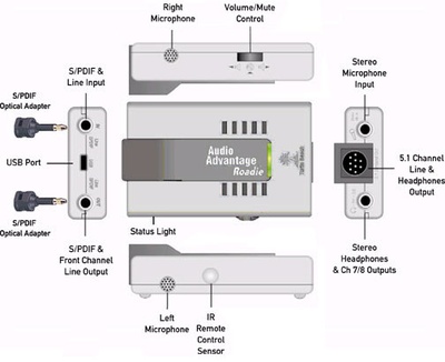 A gyártó külső hangrendszere a szokásos vonalszintű és fejhallgató-kimeneten, továbbá az egyre inkább elterjedtnek mondható, digitális hangot közvetítő SPDIF kimeneten túl vonalszintű és SPDIF bemenetet kínál, az egységhez mindezen túl akár sztereó mikrofonok is csatlakoztathatók (az Audio Advantage Roadie beépítve is tartalmaz egy ilyen mikrofont). A készülék további különlegessége, hogy fel lett készítve 5.1 csatornás fülhallgatók használatára, mindemellett 7.1 csatornás hangszórórendszerekkel is képes együttműködni.