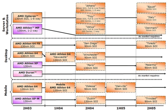 2004 második felében érkeznek a SOI-gyártással készített, de még 130 nm-es Athlon XP-k, majd őket követik 2005 második félévében a 90 nm-es Athlon XP-k, a Palermo-k. A Mobile AMD Athlon 64 2004 első felében debütál, majd ennek utódja a 90 nm-es Odessa lesz, immár a 2004-es év második részében, illetve az Oakville 2005 első 180 napjában. A 130 nm-es, Dublin-magos Athlon XP-M-t az AMD át akarja dolgozni. Helyét 2005 második félévében a 90 nm-es Trinidad veszi majd át.