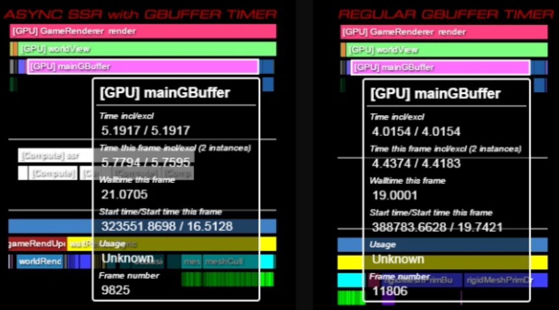 A jobb skálázás és az új technikák mellett az új Frostbite verzió hatékonyabban képes kihasználni a grafikus vezérlők erőforrásait. A futószalagok párhuzamos futtatására vonatkozó implementáció már nem csak az aszinkron DMA-ra, hanem az aszinkron compute-ra is kiterjed. Többek között az SSSR futtatható a fő G-buffer felépítésével, míg a HBAO effekt a shadow mapok generálásával párhuzamosan. Bár így a grafikai feladatok feldolgozásának ideje önmagában megnő, de a teljes képkocka számítására levetítve az aszinkron compute-ot hatékonyan kezelő architektúrákon 10%-os gyorsulásra lehet szert tenni.