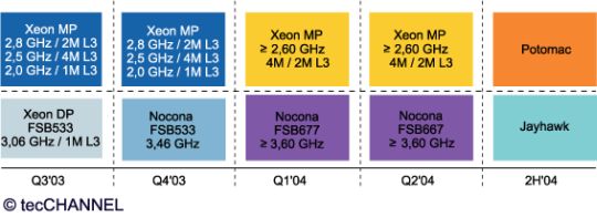 A Xeon-MP processzorból szintén három új modell jelent meg. A 2,00 GHz-es típus és a 2,50 GHz-es CPU 1 MB, míg a 2,80 GHz-es csúcsmodell 2 MB harmadszintű gyorsítótárral rendelkezik. A Xeon-MP processzorból ugyanakkor létezik egy 2,00 GHz-es, 2 MB-os gyorsítótárras változat is. A 2,00 GHz-es Xeon-MP 1.177, a 2,50 GHz-es Xeon-MP 1.980, míg a 2,80 GHz-es Xeon-MP 3.692 dollárért szerezhető be.