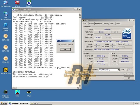 A két svéd fiatalember természetesen nem érte be ennyivel; tegnap megkaparintottak egy Core 2 Extreme X6800 processzort, amit – miután a komplett rendszert áttelepítették egy légkondicionált csarnokba – sikerült 2,8-ról 4,8 GHz-re felpiszkálniuk. Kinc és Crotale ezen az órajelen értékelhető, és hajmeresztő sebességű számítási teljesítményt csiholt ki a rendszerből (lásd kép).