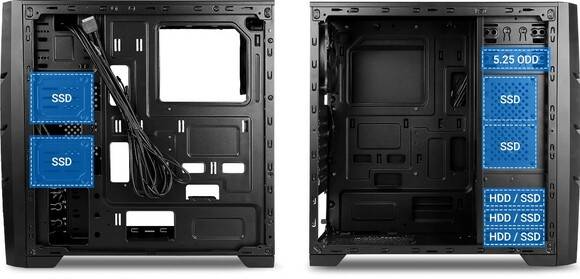 A rácsos kialakítású, egyébként levehető előlapon két darab USB 3.0 csatlakozót, és egy-egy audio ki- és bemenetet találunk, felette pedig egy 5,25 hüvelykes meghajtónak alakítottak ki helyet. Az összesen hét darab adattárolót a gépház belsejének előlap mögött található szekciójába helyezhetjük el, amiből négy darab csak 2,5 hüvelykes, három darab viszont 3,5 hüvelykes méretű is lehet. A legfeljebb 375 mm hosszú grafikus kártya a hátlapon található 7 bővítőkártya slotba illeszthető, a processzorhűtő magasságát 160 milliméterben maximalizálták. Az üresen 4 kg tömegű, 450 x 205 x 435 milliméteres dimenziókkal bíró gépház hűtéséről három darab, 120 mm átmérőjű ventilátor gondoskodik, ebből kettő fehér LED világítást is kapott. Mindhárom légkavarót lecserélhetjük vízhűtéshez szükséges radiátorokra is, ebben az esetben előre 240, hátra pedig 120 milliméter hosszú darabokat tehetünk be.