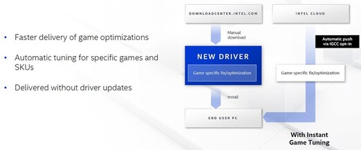 A cég a frissítést is átdolgozza. Nagyon sokszor pusztán konfigurációs beállításokra van szükség ahhoz, hogy egy új cím optimálisan működjön. Ezért felesleges lenne új meghajtót telepíteni, és így gondolja az Intel is, ugyanis ha egy játék megfelelően fut az adott API-ra vonatkozó implementáción, akkor csak egy profilt töltetnének le a felhasználóval a vezérlőközponton belül. Ez az egész egy automatikus folyamat lenne, a meghajtó majd időnként lekérdezi az Intel szerverét, és ha talál új profilokat, akkor azokat beszerzi, majd gyorsan telepíti. Ezzel az adott rendszereket gyorsan, meghajtófrissítés nélkül fel lehetne készíteni az egyes játékokra. Persze időnként olyan mértékű változásra van szükség, ami az implementáció módosítását igényli, tehát a hagyományos meghajtófrissítés nem szűnik meg. Valószínűleg nem is fog ritkulni a kiadott eszközillesztők száma, itt inkább az egyes profilok kényelmesebb és egyben hatékonyabb célba juttatásáról van szó.