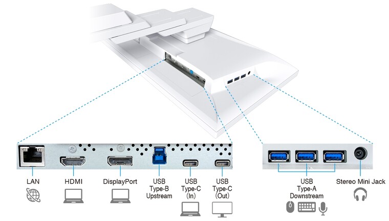 Az I/O részlegen egy DisplayPortot, egy HDMI bemenetet, egy DisplayPort alt módot támogató és 70 wattnyi energia továbbítását lehetővé tévő USB 3.1 Gen1 Type-C upstream portot, egy videojelet és 15 wattot közvetítő USB 3.1 Gen1 Type-C downstream csatolót, három USB 3.1 Gen1 Type-A kaput, egy 3,5 mm-es jacket, valamint egy gigabites Ethernetet találunk, így laptoppal például effektíve dokkolóként funkcionál a jószág.