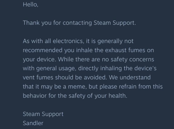 A vállalat a fentiek miatt megkéri a felhasználókat, hogy tartózkodjanak a Steam Deck szellőzőjének szagolgatásától, ugyanis van némi esély, hogy ennek káros hatásai lehetnek az egészségre.