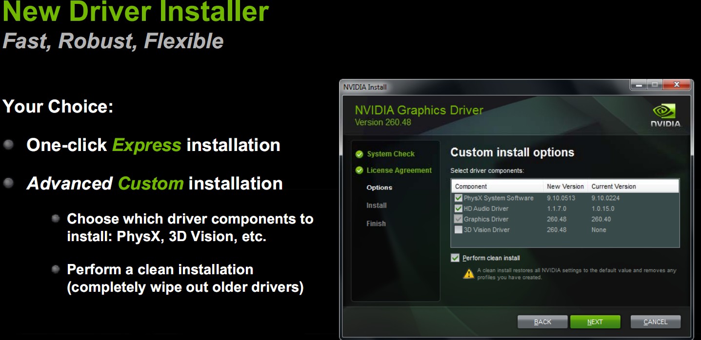 A driver telepítője teljesen megújult. Mostantól az NVIDIA is egy Catalysthez hasonló moduláris rendszert alkalmaz, amivel egyszerűbbé válik a komponensek kezelése. Az új eszközillesztő telepítése után várható változások pontos listáját az alábbi dokumentáció tartalmazza, míg maga a meghajtó – a megfelelő adatokat megadva – letölthető az NVIDIA szerveréről.