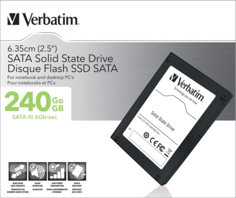 A cég bemutatta a SandForce SF-2281 kontrollerre épülő 2,5”-es SSD tárolót is, melyek 120 és 240 GB-os kapacitással és – a Verbatim kínálatában elsőként – SATA 6 Gbps csatolófelülettel kerülnek majd a piacra. Az új SSD-k maximális lineáris olvasási és írási sebessége 550/510 MB/s, de a 4 kB-os blokkokon elérhető teljesítményről nem esett szó. Az viszont biztosra vehető, hogy a két év garanciával érkező újdonságok mindegyike rendelkezik EDC/ECC hibajavítással, S.M.A.R.T monitorozási lehetőséggel, wear levelinggel és garbage collection algoritmussal, továbbá a TRIM támogatása is megoldott.