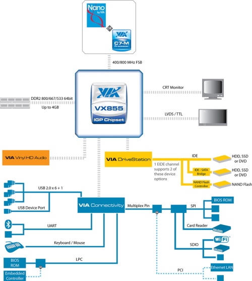 A VIA Technologies leleplezte legújabb alaplapi vezérlőhídját, mely a C7, az Eden és a Nano processzorokkal kompatibilis. Az új, VX855 típusú lapka rendkívül alacsony, 2,3 wattos TDP fogyasztással rendelkezik, aminek köszönhetően tökéletesen kielégíti a mobil és a beágyazott rendszerek igényeit.
