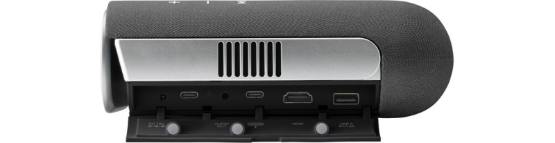 A 3 wattos harman/kardon – sztereó – hangszórókkal ellátott, 0,96 kilogrammos konstrukció fedélzetén egy 1.4-es HDMI csatlakozó, egy 5 voltos/1 amperes, közvetlen műsorszórást borítékoló USB Type-C kapu, egy második USB Type-C interfész, egy USB 2.0 aljzat, meg egy 3,5 mm-es jack található, és az 5.0-s Bluetooth kapcsolaton (mellyel egyébként hangjelet küldhetünk a vezetékmentes fejhallgatónk felé) kívül támogatja a Wi-Fi-s képtükrözést. A tipikusan 46 wattot fogyasztó, természetesen fali konnektorról is működtethető szerkezet beépített akkumulátora 12 000 mAh-s, amely normál módban cirka 1,5, energiatakarékosban pedig körülbelül 2 órányi üzemidővel kecsegtet, és az OSD menü nyelvei közt szerepel a magyar.