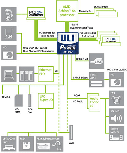 Teljes egészében a PCI Express interfészt részesíti előnyben az ULI legújabb, M1697 típusjelzést viselő alaplapi vezérlőáramköre, mely a későbbiekben olcsóbb, AMD processzorokat fogadó alaplapokon lesz elsősorban megtalálható. Az új lapkának továbbra is a legfőbb erényei közé tartozik a kiterjedt PCIe skálázhatóság, ugyanakkor az egychipes megoldás miatt az M1697-et választóknak végleg le kell mondaniuk a korábbi modellnél oly frappánsan megoldott AGP-támogatásról.