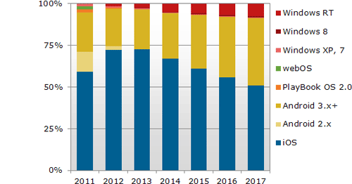 Az NPD DisplaySearch azt várja, hogy a globális piac forgalma a tavalyi 81,6 millió darabról 2017-re 424,9 millió darabra nő. Az előrejelzés szerint a termékkategóriában három nagy (illetve pontosabb így: két nagy és egy kisebb) operációs rendszer lesz versenyben: az iOS, az Android és a Windows RT, a Windows 8 ARM-kiadása. Az Apple ma domináns platformja az évek múlásával fokozatosan veszít majd a befolyásából – jelenlegi 72 százalék fölötti piacrésze 2017-re 51 százalék körüli szintre apad –, de változatlanul megőrzi első helyét. A Google Android ezzel párhuzamosan terjed, és 22,5 százalékról 40 százalék fölé nő az elterjedtsége, míg a harmadik Windows RT 1,5 százalékról 7,5 százalékra javítja pozícióját 2017-re.