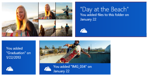 A januárban bejelentett frissítések érintették a Windows Store-ból elérhető alkalmazást is, bár itt a funkcionalitás kevésbé került előtérbe, egész pontosan megjelent az élő csempe használata, amely a tárhelyünkhöz legutóbb hozzáadott tartalmakról szolgáltat jelzés értékű információkat. Amennyiben ez a tartalom dokumentum, úgy annak neve, a hozzáadás dátuma, és a tartalmazó mappa neve jelennek meg a csempén, míg képfájlok esetén a név és a feltöltés dátuma mellett azok miniatűrjei válnak láthatóvá.