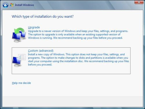 Itt szintén a Custom módot válasszuk, az ezt követő képernyőn pedig a nekünk tetsző partíciót jelöljük ki a telepítés színhelyéül. A fájlok átmásolása után a telepítő a fájlok kicsomagolása közben (második fázis) újraindítja a számítógépet. A Windows 7 indítómenüjében ekkor mindenképp a a Windows Install módot válasszuk!