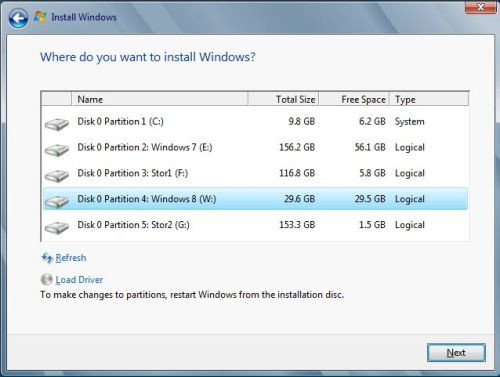 Amint kész a telepítő DVD vagy USB adathordozó, újra kell indítanunk a gépet – ügyeljünk arra, hogy a számítógép BIOS-ában megfelelő indítási sorrend legyen beállítva, vagyis a DVD olvasó vagy az USB tár előbb legyen, mint a merevlemez. Némi várakozás után elindulhat a telepítés a nyelv és egyéb lokalizációs jellemzők kiválasztása után, valamint az "Install now" felíratra kattintva. A telepítés típusa mindenképp Custom, vagyis egyéni legyen, mert csak ekkor van lehetőségünk magunk választani a partíciók közül.
