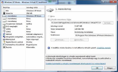 Friss virtuális gépünket végignézve láthatjuk, hogy erőforrásait dinamikus kiosztásban kapja a rendszer, a merevlemez partícióit hálózati meghajtóként érzékeli, míg a saját merevlemezét 130 gigabájtosnak látja; a valóságban ez utóbbi egy dinamikusan növekvő fájl, melynek helyét a gép leállítása után tudjuk módosítani a beállításokon belül. A kiosztott RAM mennyisége alapértelmezés szerint 256 megabájt, de ezen is és a virtuális merevlemezek számán is módosíthatunk; azonban ezt természetesen csak kikapcsolt XP mellett tehetjük meg.
