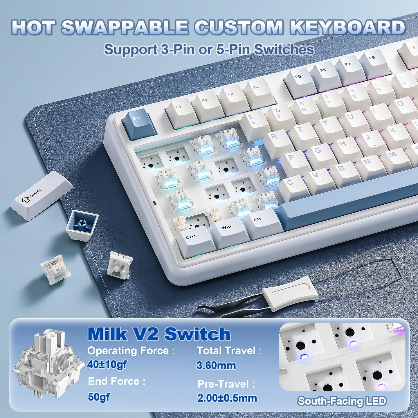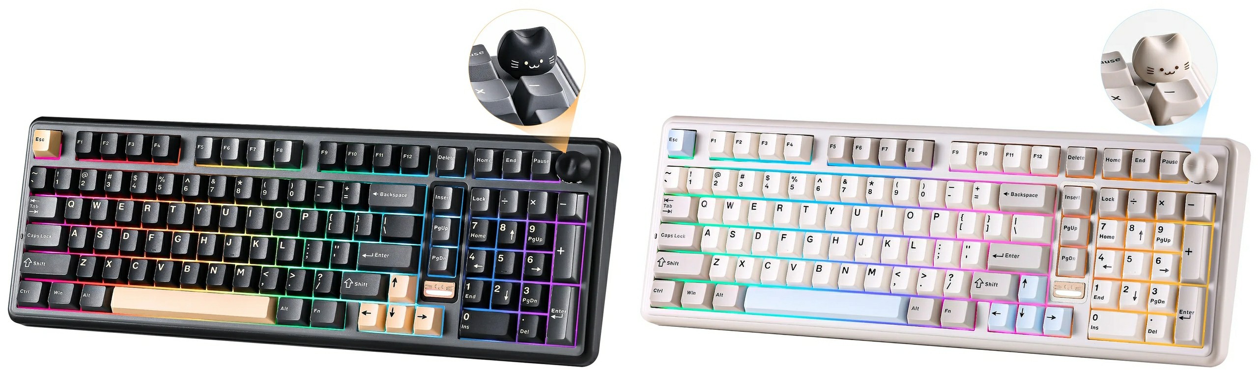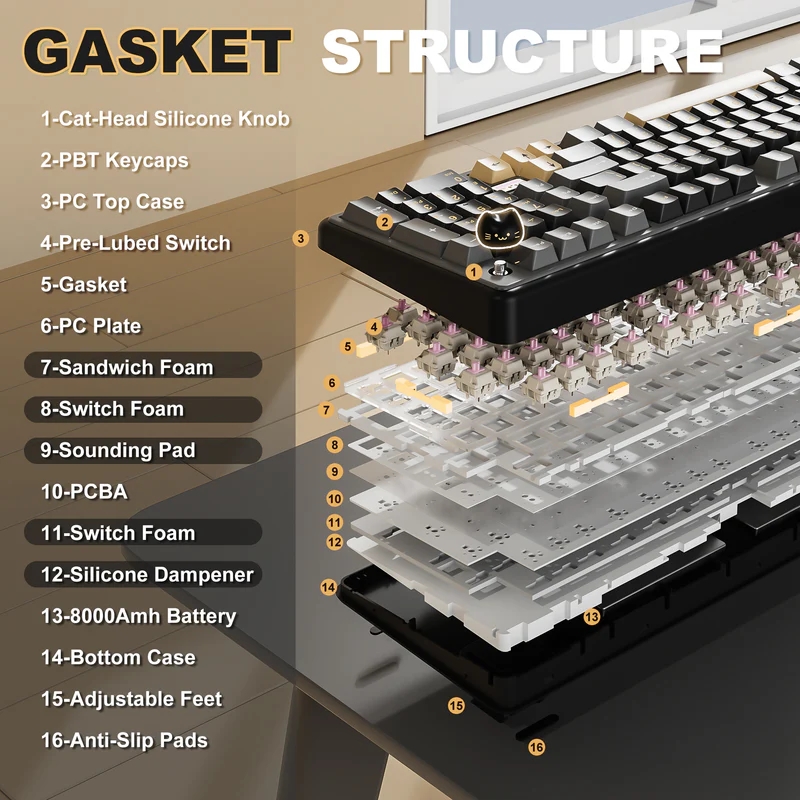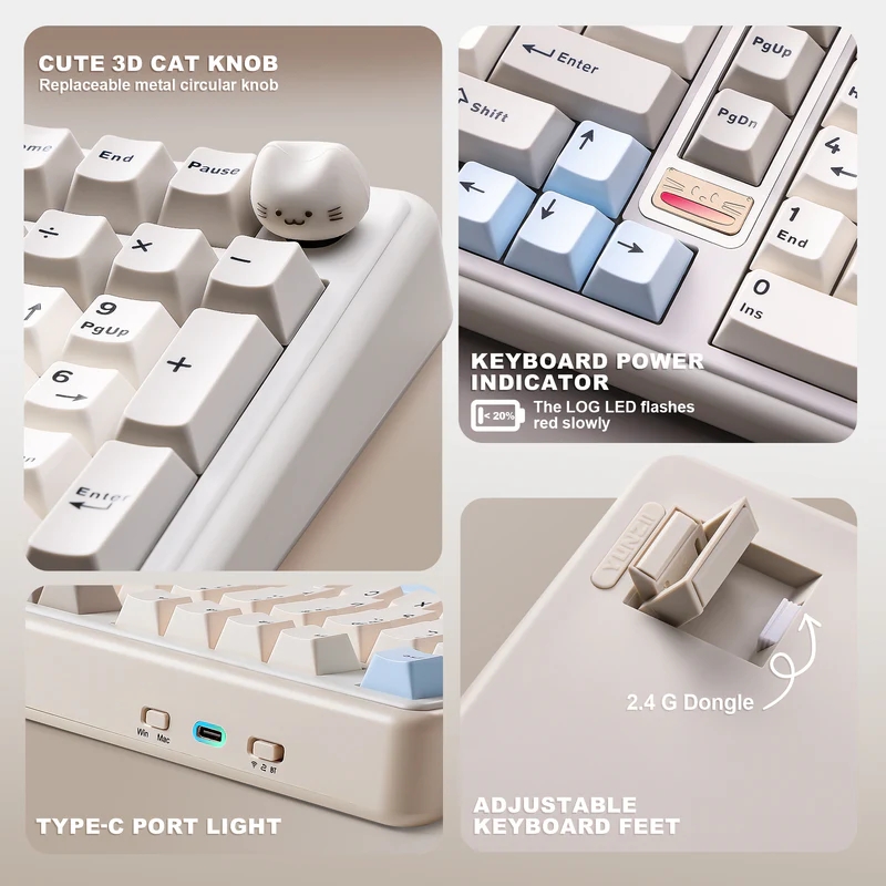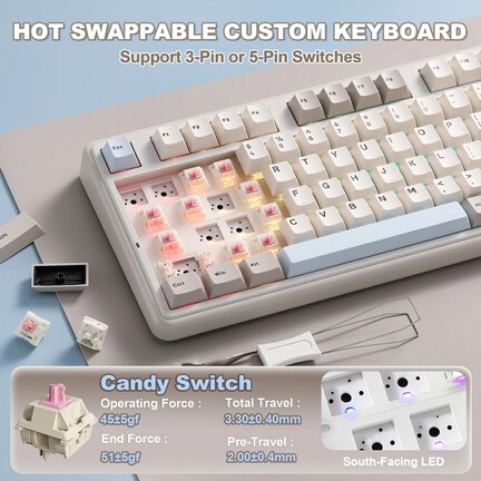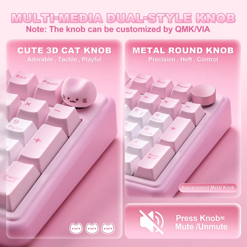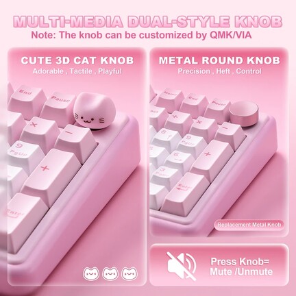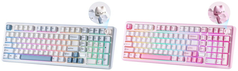 A flex cutos polikarbonát plate-tel érkező, vezetékmentes tasztatúra gyorscserés foglalataiba alapból gyárilag lubrikált, lineáris karakterisztikájú Yunzii Milk V2 (40/50 gf, 3,6/2 mm) vagy Yunzii Candy (45/51 gf, 3,3/2 mm) switch-eket kérhetünk, amelyeknek szárain kettős fröccsöntéssel készített "PBT" (a valóságban valamiféle keverék, jó eséllyel PBT/ABS) kupakok telepednek meg. A Cherry profilos billentyűsapkák nem eresztik át a déli tájolású RGB LED-ek fényét, és a periféria jobb felső sarkában egy programozható, (szilikongumiból lévő, benyomható) cicafejes tárcsa található, ami talán a legelvetemültebbek kawaii-igényét is kielégítheti (a marconább lelkületűek örömére egy hagyományos, fémverzió is akad a csomagban). A mérlegen 1161 grammot nyomó jószág stabilizátorairól sem felejtették le a kenőanyagot, és műanyag kültakarójának felülső eleme polikarbonátból van, a belsejében pedig öt rétegnyi csillapítás tereli mélyebb egyenirányba a püfölés közben produkált hangot.