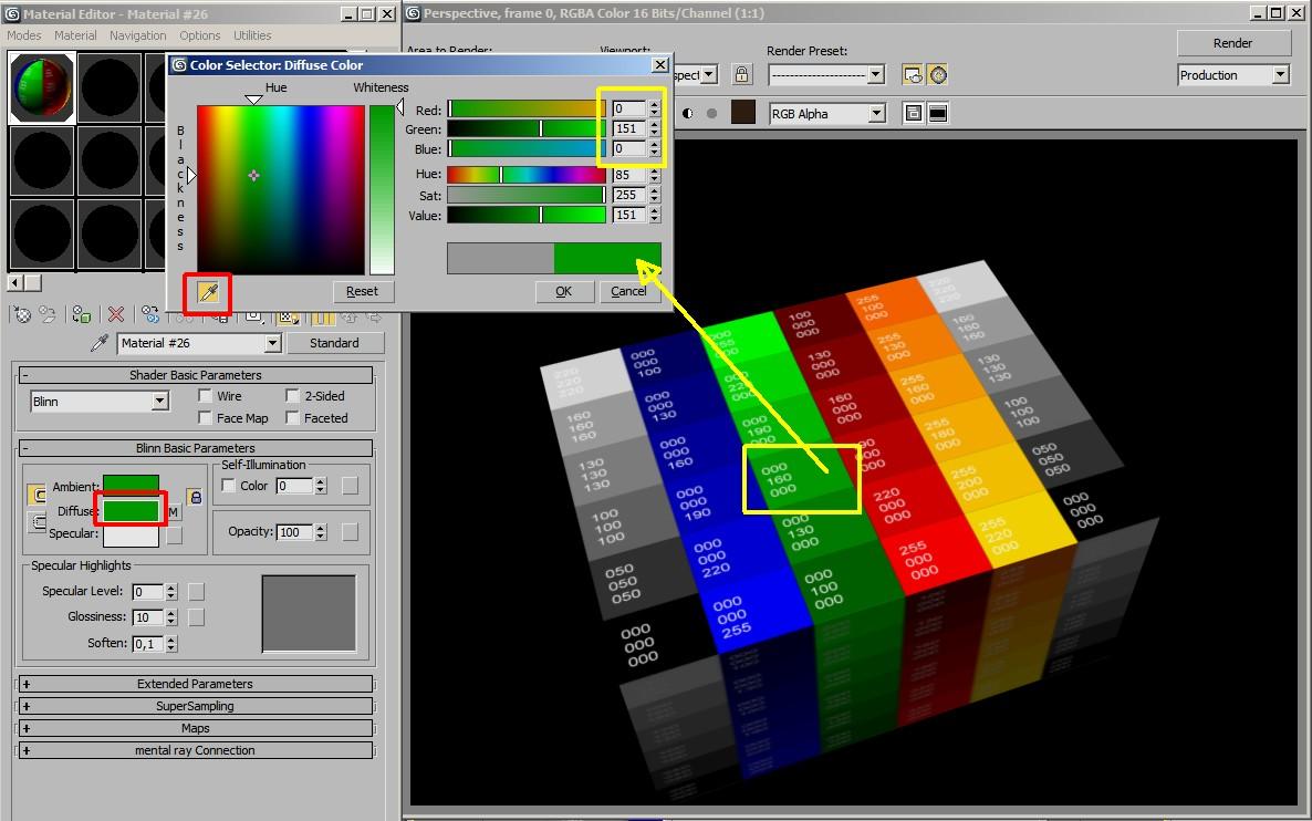 Rárakod egy kockára, gömbre, akármire. Bevilágítod, lerendereled. Megnyitod a render ablak mellett a Material Editort, bármelyik anyagnál ráklikkelsz a Diffuse színválasztó ablakára, erre előugrik a Color Selector ablak. Itt klikk a pipettára, vidd a render fölé a lerenderelt textúrára, és leolvashatod az RGB értékeket.A Print Screen-en nem látszik, de ott van a pipetta, ahol a sárga négyzet a render ablakban.