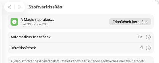 Terminálos varázslat sem vezet eredményre:sudo softwareupdate -l 'macOS Tahoe 26.4.1-25E253' -RPassword:Software Update ToolFinding available softwareNo new software available. -
