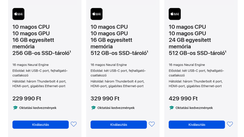 A belépő Mac Mini M4 230eFt, nem 400, feleségem tanár...