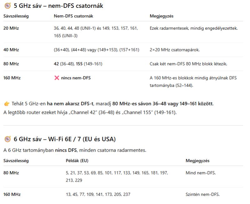 A router wifi beállításainál van. A DFS csatornák olyanok, hogy induláskor és időnként ezeket a csatornákat a routernek tesztelni kell nem ütközik e egy időjárási radaral vagy bármi mással ami hivatalaosan 5Ghz-el megy. Ha ütközik, keresnie kell egy másikat, ha nem ütkizik akkor marad. Ez a vizsgálat induláskor jelentős menet közben már kevesebb időt vesz igénybe, de ez okozhat lagot. Vannak olyan csatornák amik nem ilyen dinamikusak, és azokon nem üzemel ilyen rendszer azok nem vizsgálna semmit.