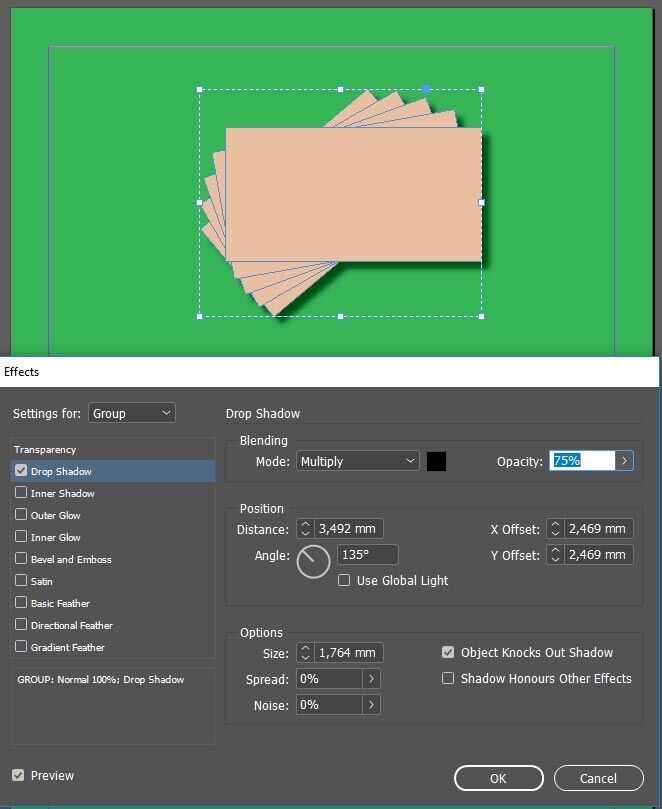 Na, most szeretném, ha a kártyák szép árnyékot vetnének egymásra. Ha InDesign-ban ráadom a Drop Shadow-t, akkor az egészet egyetlen alakzatként kezeli, és úgy árnyékolja, nem pedig külön-külön.