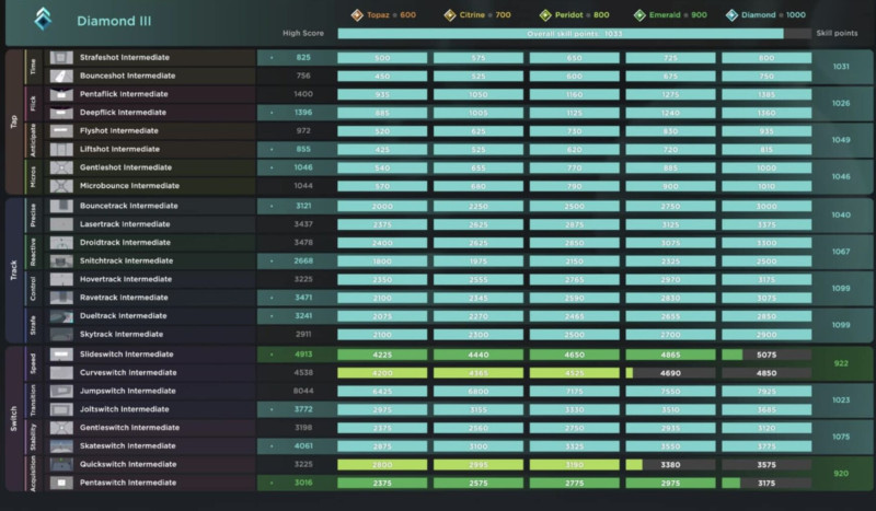- Voltaic guidesViscose nemrég csinált Kovaak's-ra bechmark formájában egy "felmérőnek álcázott" fejlesztő eszközt. Az aimtraining közösség is jelenleg ezt ajánlja, mert talán az általánosan leghasznosabb helyzeteket gyűjtötte össze és benchmark révén célokat ad, irányt mutat és jól követhetővé teszi a fejlődést.